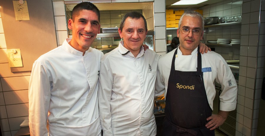 Ελλάδα, εκπαιδεύει, βγάζει πιάτα μαζί με τον πολύ καλό chef de cuisine Άγγελο Λάντο (δεξιά του del Burgo στην φωτό), αλλά και τον –επίσης chef de cuisine- William Mahi και προετοιμάζεται